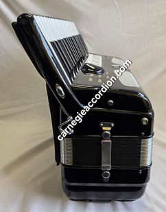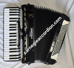 This full-size Atlas accordion has 41 treble keys measuring in at a 19-1/4" keyboard, 120 bass buttons, 4 sets of hand-finished LMMH treble reeds (low, middle, middle, high), 5 sets of hand-finished bass reeds, 8 treble registers plus a palm master switch, 5 bass switches, and comes with new 3" wide velvet shoulder straps, new nylon chest pad, and new velvet bass strap (an added $245 value). This accordion also comes with a pre-owned hard-shell carrying case, it has very nice compression, and weighs approximately 23 lbs.